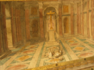 It might not be very clear but there is a broken Greco-Roman statue on the floor while a crucifix is triumphant above it. (Lovely perspective in the room isn't there? - the floor and the walls)